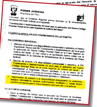 Del convenio Nº 1 se desprende el cuarto indicio de irregularidad. La cláusula sexta de este documento dio“luz verde”para la construcción y la implementación del local de la Corte Superior de Justicia del Santa.