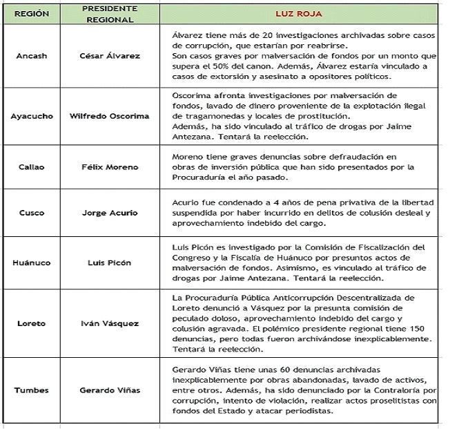 Chimbote en Línea (Anticorrupción).- A propósito de las elecciones regionales y municipales de octubre próximo, la situación de ingobernabilidad en varias regiones del país se torna preocupante por las graves acusaciones en los que se ven envueltos los Presidentes Regionales.
