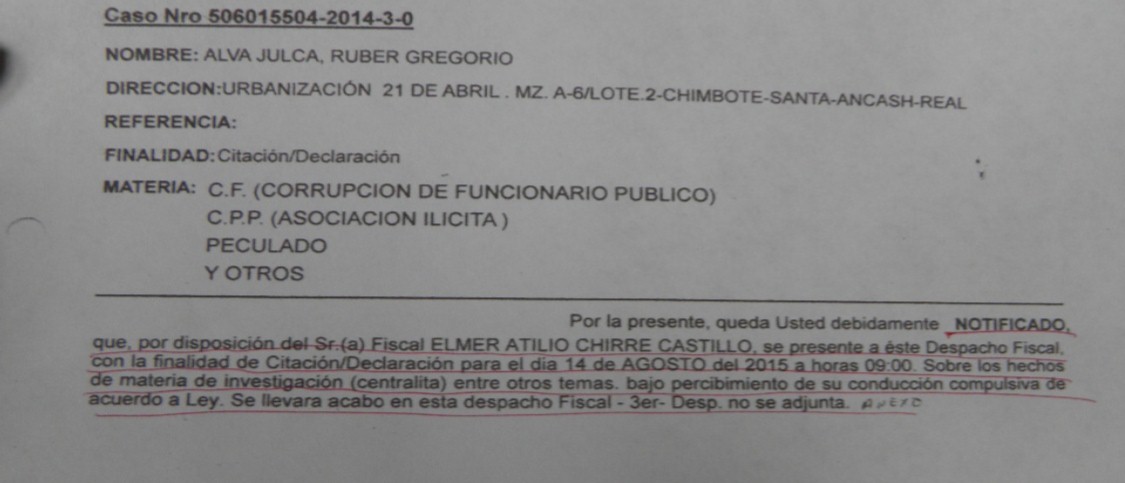 Chimbote en Línea.- Para este 14 de agosto la Fiscalía Supraprovincial Anticorrupción de Lima citó a las 9 de la mañana en calidad de testigo al propietario del canal 41, Real Televisión Chimbote, Ruber Gregorio Alva Julca, como parte de las investigaciones que se sigue por el caso "La Centralita".
