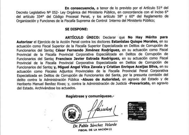 Chimbote en Línea.- Se hizo justicia. Por considerar que no hay mérito para denunciar penalmente a los exfiscales que allanaron el local conocido como "La centralita" en Chimbote, el fiscal de la Nación, Pablo Sánchez Velarde, decidió archivar definitivamente la investigación en contra de estos abogados que fueron injustamente retirados del Ministerio Público.