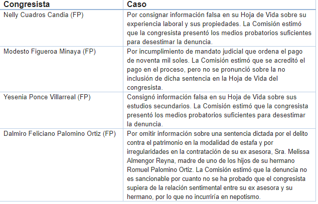 Varios casos quedaron fuera en esta etapa del proceso. Uno de los más conocidos fue la segunda denuncia contra la congresista de las filas de Fuerza Popular representante de Áncash, Yesenia Ponce por declarar información falsa en su Hoja de Vida. La Comisión decidió que el hecho no ameritaba sanción.