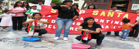 (Chimbotenlinea.com- Texto y foto Lindberg Cruzado).- Los maestros afiliados al SUTE Santa realizaron esta mañana un acto simbólico de lavado de banderas en la plaza de armas de Chimbote para protestar y rechazar el proyecto de ley de la reforma educativa presentado en el Congreso de la República por el gobierno del presidente de la República, Ollanta Humala Tasso.