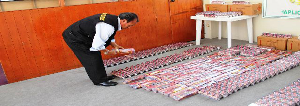 Efectivos policiales y fiscal penal Mario Rodríguez efectuaron esta mañana un operativo inopinado en el Terminal Terrestre “El Chimbador” y decomisaron nueve cajas grandes de artefactos pirotécnicos que iban a ser vendidos en los mercados de esta ciudad. (Texto y foto Lindberg Cruzado)
