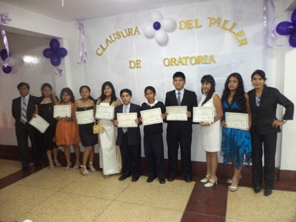 Como lo expresa William Channing: “Un hombre de fuerza e inteligencia extraordinaria puede no ser más que un cero en la sociedad si no sabe hablar” .Es así que los docentes Ernesto Domínguez D. y Elena Castañeda S. del taller de Oratoria de nuestra institución con mucha dedicación y amor hacia sus alumnos, incentivaron este arte a un grupo de jóvenes, quienes demostraron su talento y todo lo que aprendieron durante los tres meses que duró el taller, el martes 27 de noviembre a las 5:00pm.