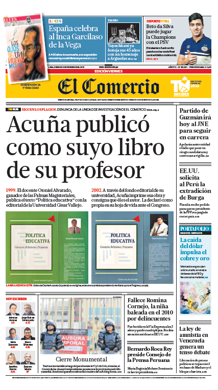 Chimbote en Línea.- “Apláudanme pues” expresó el candidato a la Presidencia de la República, César Acuña Peralta, en su presentación ayer en el Foro Anticorrupción que organizó la Contraloría General de la República, tratando de dar respuesta a las acusaciones de plagio de su tesis doctoral. Hoy, Acuña es protagonista de la gran portada del diario El Comercio, cuya unidad de investigación descubrió que plagió un libro completo de su profesor de maestría.
