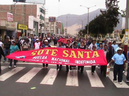 Chimbotenlinea.com (Por Milton Palpa).- Preparan ollas comunes. Continuando con su medida de lucha, los maestros del Sindicato Único de Trabajadores de la Educación (Sute) Santa quienes acatan la huelga nacional indefinida, recorrieron las calles de Chimbote exigiendo la vigencia de la ley del profesorado 24029, que garantiza la estabilidad laboral de los docentes.