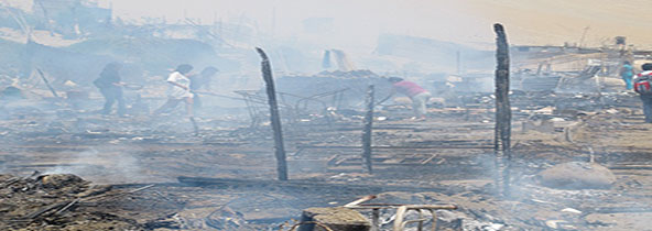 En menos de diez minutos, un pavoroso incendio dejó en escombros quince ranchos en el asentamiento humano Ampliación Primavera Alta. Las chispas de fuego de la cocina a leña de una de las moradoras provocó el siniestro. (Texto y foto Lindberg Cruzado)