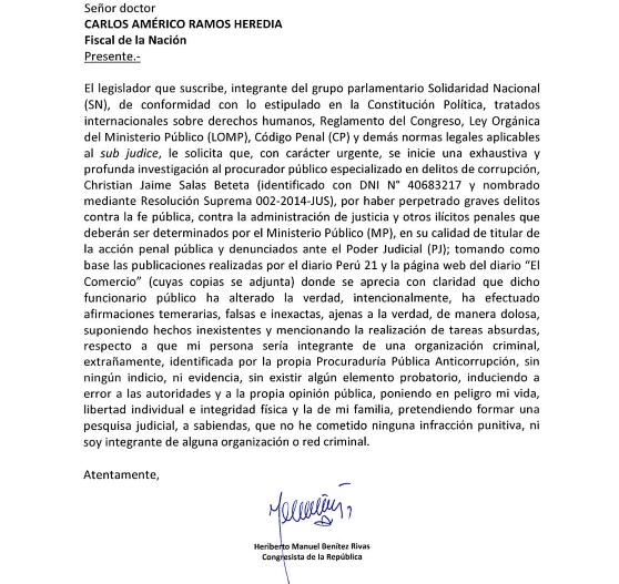 Chimbote en Línea (Congresistas).-El congresista de la República, Heriberto Benítez Rivas, denunció hoy ante el fiscal de la Nación, Carlos Ramos Heredia, al procurador nacional especializado en delitos de corrupción de funcionarios, Christian Salas Beteta.