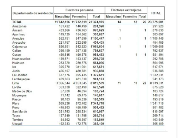 En Lima son más de 8 millones de ciudadanos aptos para sufragar. La Libertad es el departamento que concentra el segundo lugar con mayor población electoral que superan el millón de electores: 1 millón 372 mil 611 electores. Seguida de Piura, con un millón 341 mil 716 votantes, y luego Arequipa y Cajamarca.