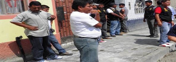 Un sujeto que resguarda al dirigente de construcción civil, Víctor López Padilla, se paseó esta mañana con una retrocarga en la mano en las narices de los agentes de la Unidad de Protección de Obras Civiles de la Policía Nacional en el pueblo joven San Miguel, donde el lunes sembraron el terror en la población a punta de balas.(Unidad de Investigación)
