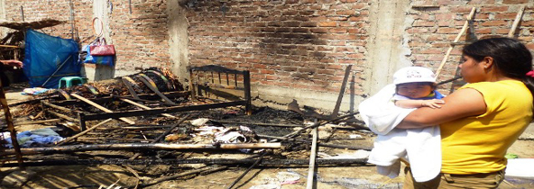 Un siniestro arrasó con gran parte de una precaria vivienda en la segunda etapa del asentamiento humano Las Delicias,en Nuevo Chimbote. Una bebé de apenas cuatro meses de nacida resultó ilesa al ser rescatada por su madre, una menor de 15 años de edad que arriesgo su vida para sacar a su hija de las llamas. La familia perdió los ahorros de Navidad a escasos días de la fiesta.(Por Cintia Cabrera)