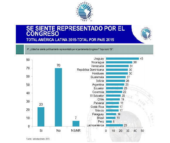 Chimbote en Línea (Por: Gerardo Távara Castillo) El Latinobarómetro es un estudio de opinión que se aplica desde hace 20 años en 18 países de América Latina mediante entrevistas a aproximadamente 20 mil personas. Los resultados de este estudio para el año 2015 revelan que el Perú es el país en que la población se siente menos representada por el Congreso, y también la que siente menos confianza en el Gobierno.