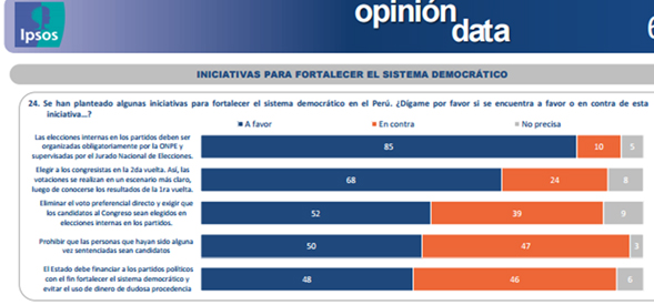 En materia de reforma electoral, la población demanda mayor transparencia en el financiamiento de las campañas y mayor democracia al interior de los partidos políticos. Ver reportes IPSOS, setiembre 2015