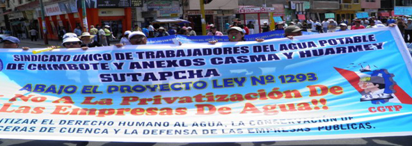 Unos 500 trabajadores de Sedachimbote acataron hoy un paro de 24 horas para rechazar la privatización de las empresas del agua que pretendería llevar adelante el gobierno del presidente de la República, Ollanta Humala Tasso, a través del proyecto de ley Nº 1293.(Texto y foto Milton Palpa)