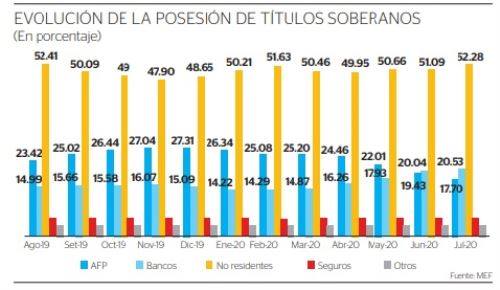 A julio del 2020, la participación de los inversionistas no residentes en la tenencia de los títulos del Perú en moneda local aumentó de 50.21% del monto emitido en enero a 52.28%, explica.
