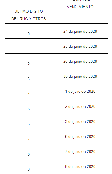 Inicialmente, las fechas de vencimiento para presentar la declaración del IR eran del 25 de marzo al 9 de abril, dependiendo del último dígito de su RUC. Ahora, son del 24 de junio al 9 de julio del presente año.