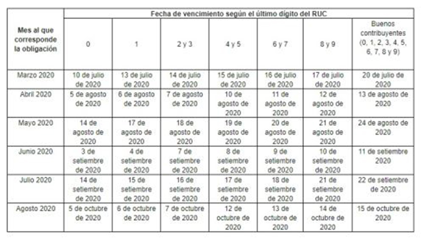 Adicionalmente, para los contribuyentes que hubieran obtenido ingresos de hasta 21 millones de soles, se amplían las fechas de vencimiento para la declaración y el pago de las obligaciones tributarias mensuales de los períodos marzo a agosto de 2020, de acuerdo con el siguiente cronograma: