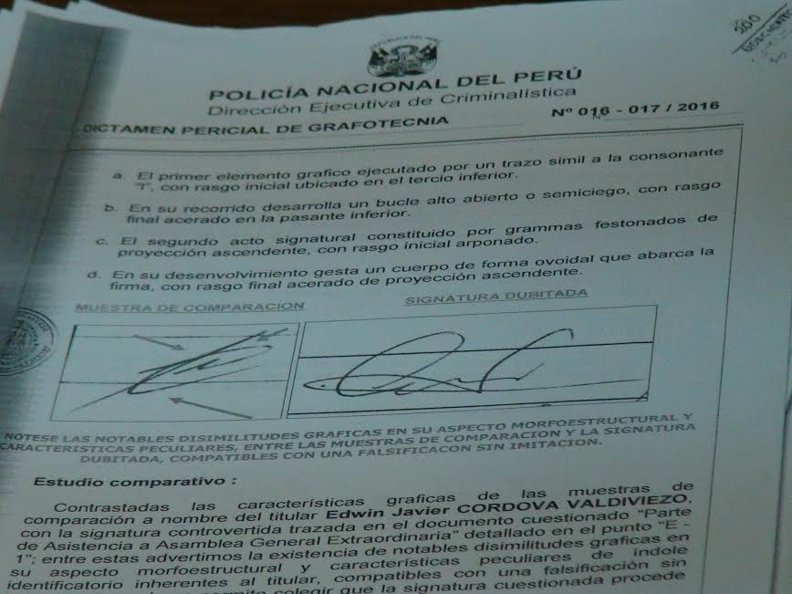 Para hacer esta labor pericial, los agentes recogieron las muestras graficas de los titulares y cuando se hicieron los exámenes se concluyó de que las firmas que estaban registradas en acta de la asamblea general extraordinaria no les correspondía; sin embargo se logró que el dirigente se mantenga en el cargo.