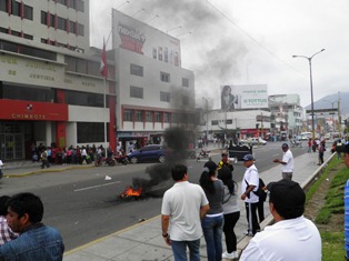 Esta mañana los trabajadores quemaron llantas en el frontis de la Corte Superior de Justicia del Santa. (Por: Lindberg Cruzado)