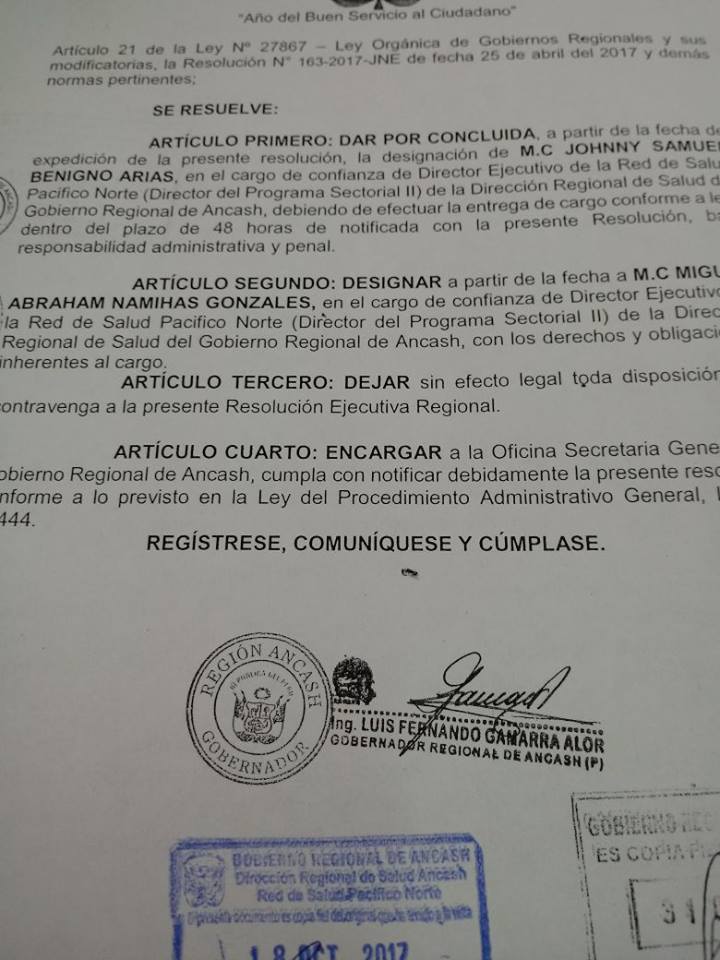 Chimbote en Línea.- Con la Resolución Ejecutiva Regional Nº 481- 2017 con fecha 31 de octubre, el gobernador de Áncash oficializó el cese del cargo al médico Jhonny Samuel Benigno Arias de la dirección ejecutiva de la Red de Salud Pacífico Norte, quien tuvo gruesos cuestionamientos al desarrollo de su gestión.