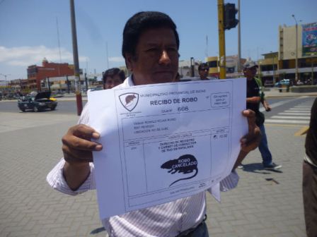 “Como taxista me siento indignado y vengo a protestar en contra de la municipalidad de ratas, pues en el año 2004 hemos pagado 10 nuevos soles para obtener nuestro carnet de conductor, que hasta el día de hoy no nos entregan y ahora como van entregar un nuevo certificado para los choferes, pedimos que se nos devuelva el dinero o que se nos exonere del pago de 8 nuevos soles, que sería lo más justo”, exhortó molesto.