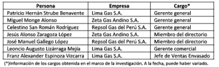Los involucrados son: Repsol Gas del Perú S.A. (Solgas), Zeta Gas Andino S.A. y Lima Gas S.A. El acuerdo es particular en cuanto a la participación de Llama Gas S.A. y Forza Gas E.I.R.L., ya que la primera empresa solo habría participado en 2010 a nivel nacional, mientras que la segunda empresa solo habría participado en 2011 en la ciudad de Huancayo.