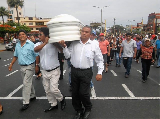 El féretro de la “Tía Sarandonga” fue paseado en hombros por las principales avenidas y calles y en la plaza de banderas de Chimbote donde se realizan los mítines gremiales, dirigentes del sindicato de Siderperú recordaron sus incansables participaciones en jornadas de protesta.