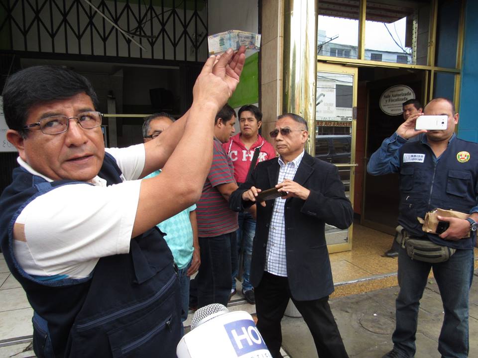 Durante su recorrido el especialista de la OCN, Américo Medina Rojas, revisaba de manera minuciosa cada uno de los billetes que usan los cambistas para su trabajo diario y además se les enseñó cómo identificar una moneda y billete original.