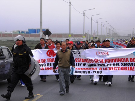Chimbote en Línea (Locales).- Una multitudinaria marcha de protesta encabezaron los servidores públicos en Chimbote y Nuevo Chimbote para demandar la no aprobación del proyecto de ley del servicio civil, el cual consideran lesivos para los intereses de los trabajadores del país.