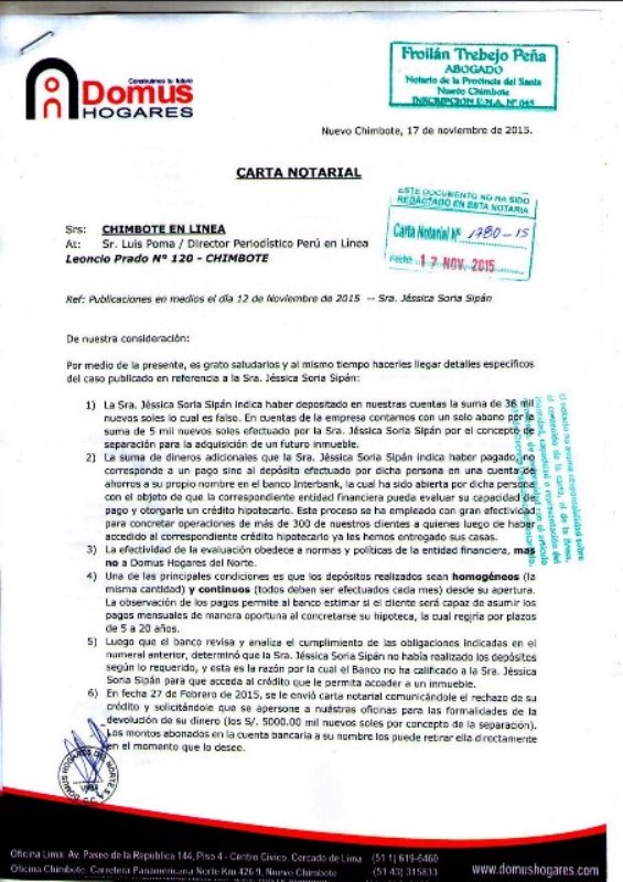 Según se aclara en una carta notarial dirigida a nuestro medio; es falso que esta persona haya depositado esta suma de dinero a las cuentas de esta empresa. “En cuentas de la empresa contamos con un solo abono por la suma de 5 mil nuevos soles efectuado por la Sra. Jéssica Soria Sipán por el concepto de separación para la adquisición de un futuro inmueble”, se describe en el documento.