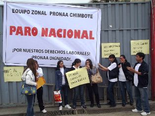 El equipo zonal de Pronaa Chimbote con arengas y pancartas en manos, acompañados de una tradicional olla común acata un paro de 24 horas exigiendo ser reubicados en otras plazas de los programas sociales que ofrecerá el Gobierno Central, debido a que el 31 de diciembre se concretará el cierre de dicho programa.