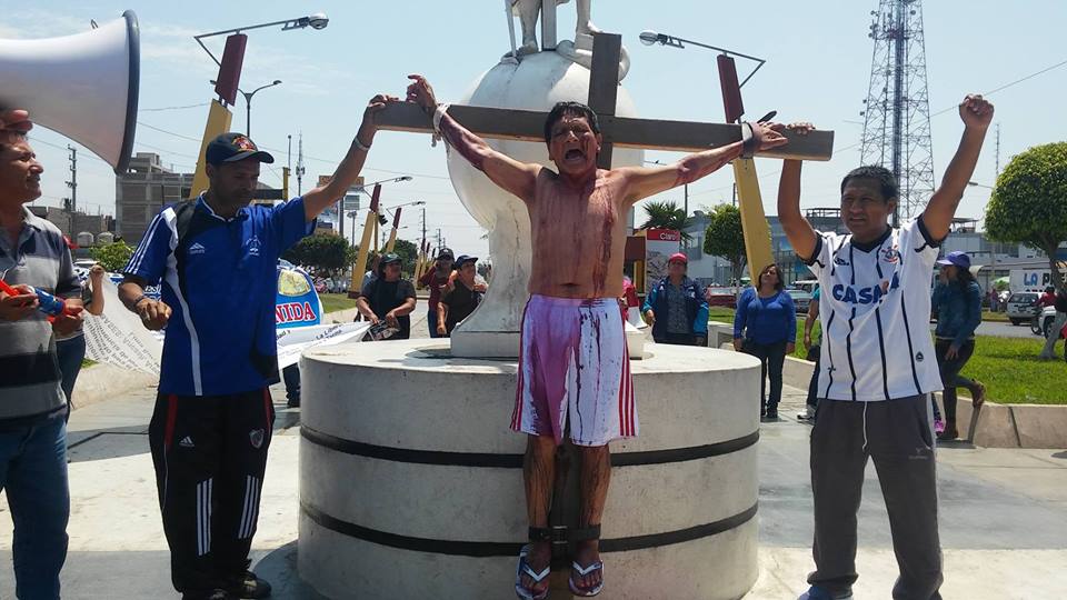 Tras hacer su recorrido por las principales calles de Chimbote, los quejosos se apostaron en el frontis de la sede judicial para crucificar a uno de servidores, en alusión al rechazo de la no aprobación de su presupuesto.