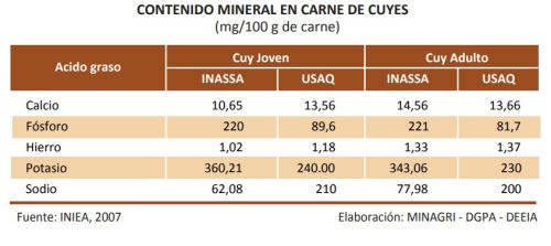 Por su parte, el estudio “Evaluación cualitativa de la carne de cuy-Análisis bromatológico”, elaborado por el Instituto Nacional de Investigación Agraria (INIA), realizó el análisis de la composición química de la carne y la piel de cuy, así como análisis de aminoácidos en carne y piel de cuy, grasa muscular, colesterol y minerales.