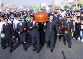 Chimbotenlinea.com (Por. Cintia Cabrera) .- Los efectivos de la comisaría de Buenos Aires rindieron un homenaje póstumo al Suboficial de Tercera PNP Manuel Pesantes Vásquez. Sus compañeros de la Escuela Técnico de Suboficiales, promoción “Fortaleza” cargaron en hombros el ataúd del joven policía quien perdió la vida en mientras cumplía sus servicios en la dependencia policial de Huarmey.(Foto Cintia Cabrera)