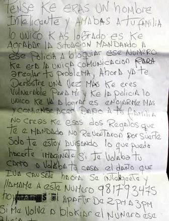 También le han dejado en su inmueble una carta amenazante, en la que le advierten que si no llega a un acuerdo con los delincuentes y continúa por su parte pidiendo apoyo a la policía van a atentar contra su familia.(Por Lindberg Cruzado)