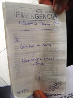 Según el médico de turno del Hospital La Caleta, Allan Vásquez Tejada, sufrió una contusión en la nariz con hemorragia, por cuyo diagnóstico le han dado 4 días de descanso médico.