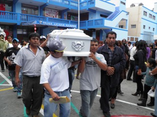 30/07/2012 (Chimbotenolinea.com ).- Desgarradoras escenas de dolor protagonizaron hoy la madre, familiares y compañeros de escuela, del pequeño Manuel Lescano Ancajima, de 8 años, quien es una víctima más de la violencia y la inseguridad que se vive en nuestra ciudad. Manuelito, fue un niño muy amado, y eso se pudo comprobar esta mañana durante el homenaje que sus amigos y profesores le rindieron en el colegio Antonio Raimondi. (Fotos: Lindberg Cruzado)
