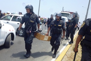 Al menos, 50 efectivos hicieron su aparición en la avenida Pardo y los ánimos de los docentes se alzaron cuando descubrieron una caja de gas pimienta cargada por los efectivos quienes se repartieron las unidades, que servirían para dispersar a la masa.