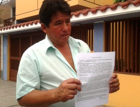 Chimbote en Línea (Regionales).- Mostrando un volante incriminatorio, el gobernador del distrito de Macate, Juan Zegarra Villanueva, denunció públicamente que el alcalde del referido distrito, Victor Arteaga Martínez y personas mal intencionadas de su entorno, repartieron cientos de pasquines a los pobladores, tratando de hacerle quedar mal como autoridad. (Foto: Milton Palpa)