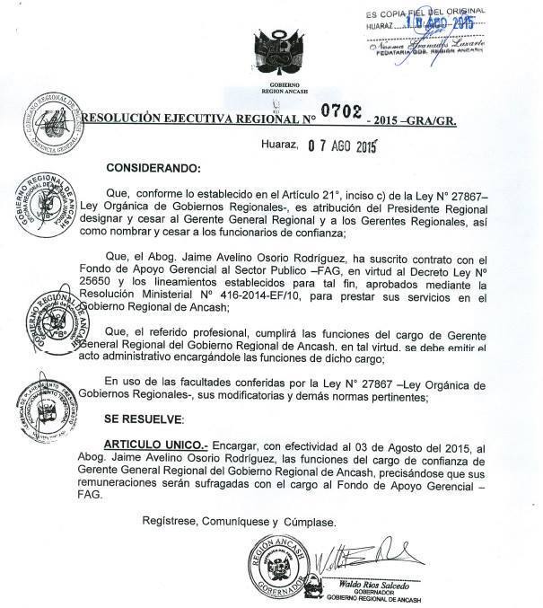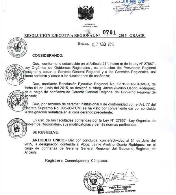 Según la Resolución Ejecutiva Regional N° 0701-2015-GRA/GR, del 7 de agosto la autoridad regional da por concluida la designación de Osorio Rodriguez en la gerencia general, medida que se hace efectiva desde el 31 de julio del presente año.