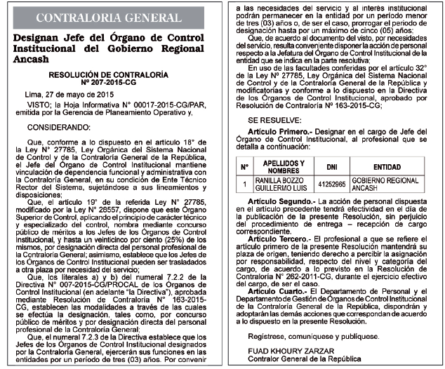 Chimbote en Línea.- Tal como lo señala la Resolución de Contraloría N° 207-2015-CG, del 27 de mayo, publicada hoy en el Diario El Peruano, este órgano designó al nuevo jefe de Control Interno del Gobierno Regional de Áncash.