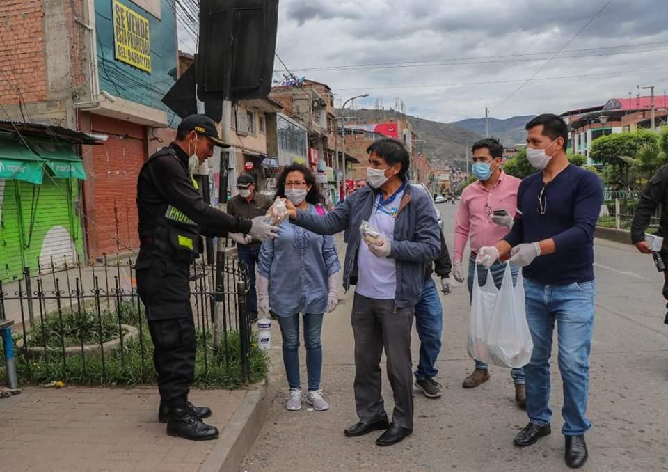 En la capital de Áncash, Huaraz, el alcalde, Rori Mautino, acompañado de sus regidores y funcionarios recorrió las calles de la ciudad para ofrecer alimentos y desinfectantes a las fuerzas del orden.